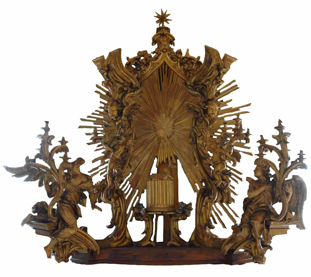 This wooden artwork was utilized for the adoration of the Blessed Sacrament in the Pauline Chapel, which was exposed in a sealed, transparent urn for 40 hours. The 40 hours represent the amount of elapsed time from the death of Jesus Christ to His Resurrection. This artwork has a religious and devotional significance, and it is an example of the artistic excellence within the Pontifical workshop.